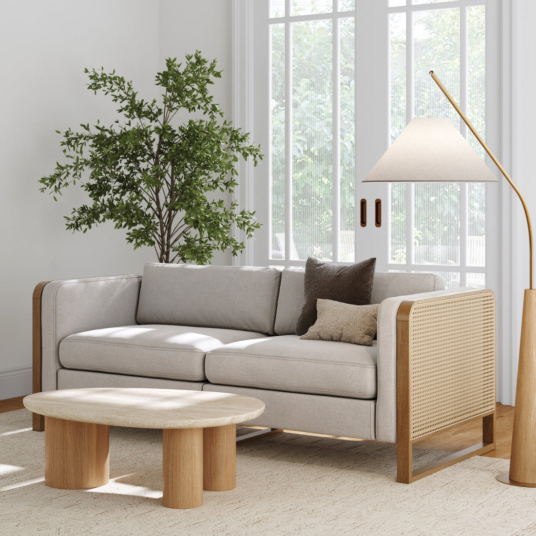 Boho 4-Seater Sofa Solid Wood Legs & Rattan Arm Camel