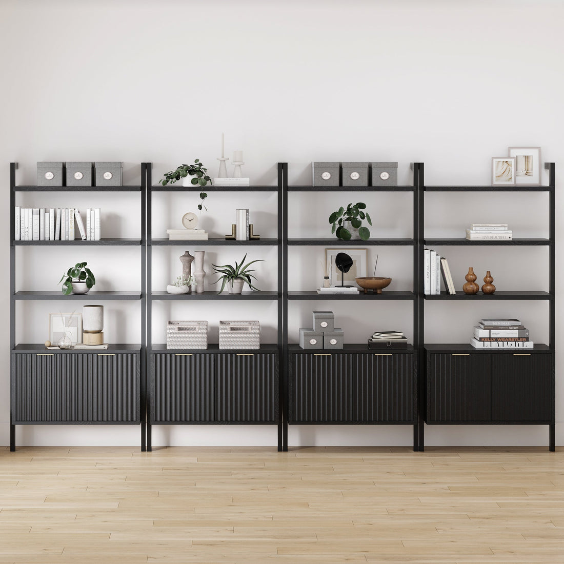 Mid-Century Fluted Wall Bookshelves with Doors Black (Set of 4)