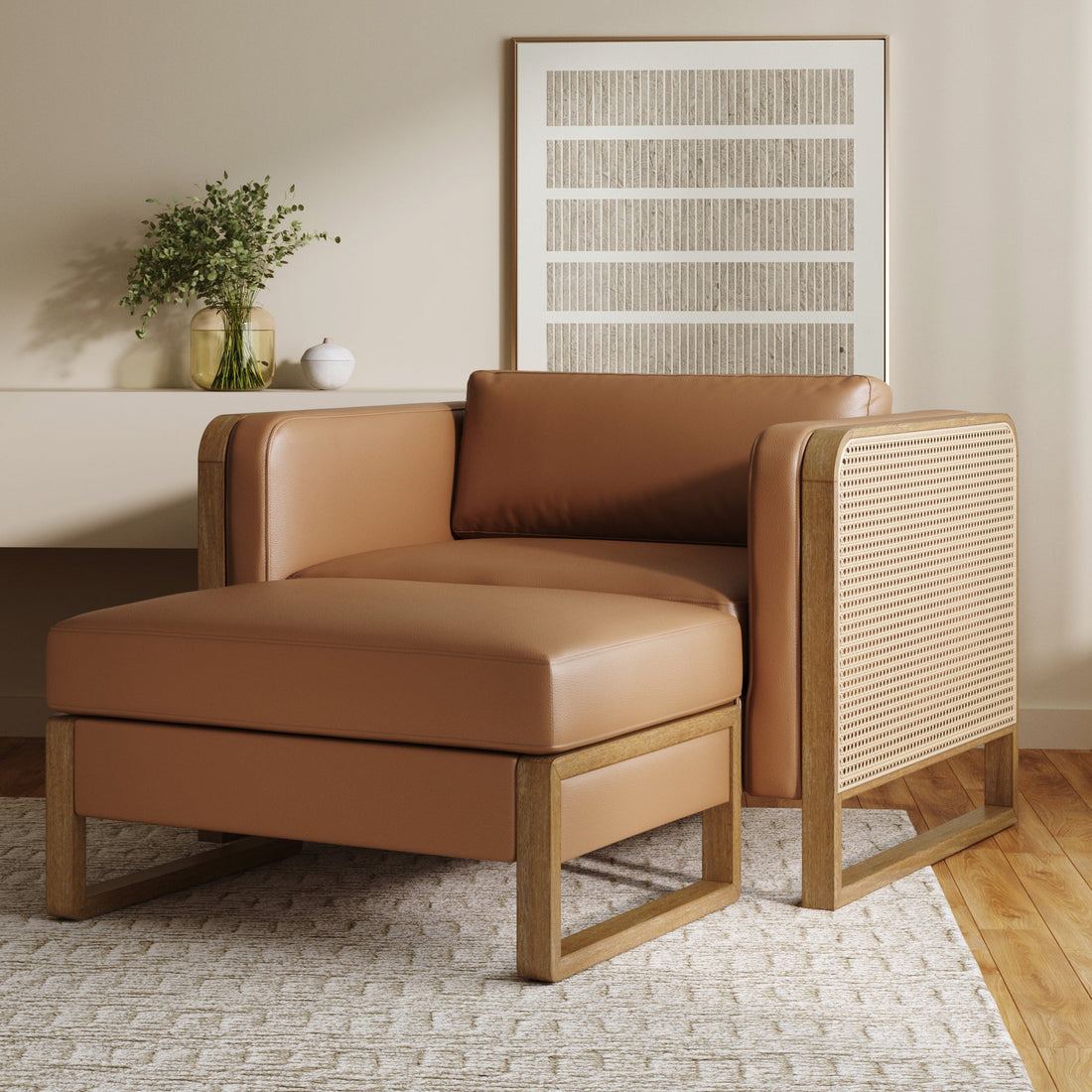 Solid Wood Rattan Accent Chair with Ottoman Set Camel