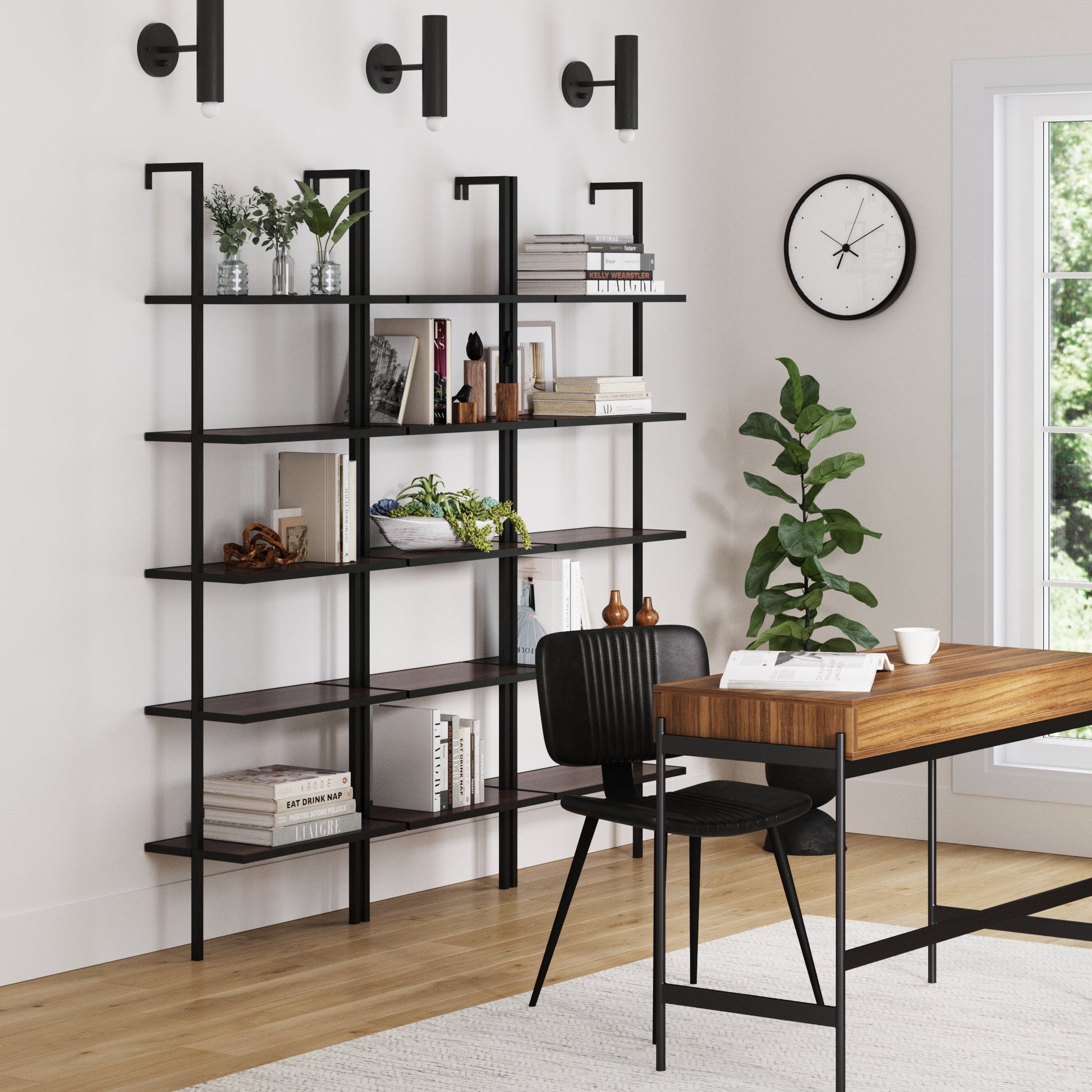 Theo bookcase dresses up any space with understated glamour and sophistication. Contrasting wood shelves with a black metal edge, with five shelves offering substantial storage in a office, living space, bedroom and beyond. With just the right touch of metal and wood, this large-scale storage piece is a polished piece to show off your favorite books and decor pieces. Made of quality materials to ensure the product’s structural integrity over time. Create complete modular wall unit by lining several bookcases up together on a wall.