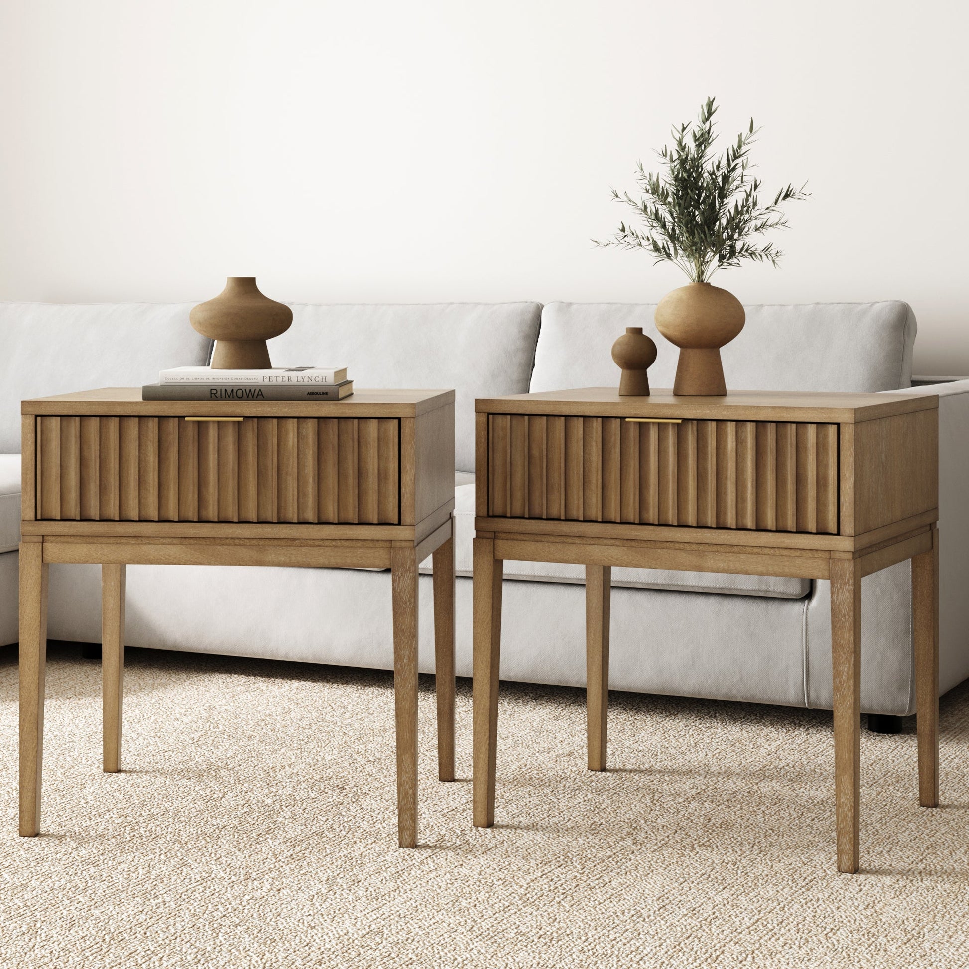 The perfect place for your bedside essentials. Meet Jasper! Jasper features a fluted drawer front in a light brown finish and tapered legs that balance the sleek profile. This bohemian-inspired nightstand effortlessly blends beauty with functionality. The front drawer boasts a simple and stunning brass color handle that opens to reveal deep storage to help keep your items organized. Use it in the living room, entryway or bedroom—this nightstand is as versatile as it is stylish.