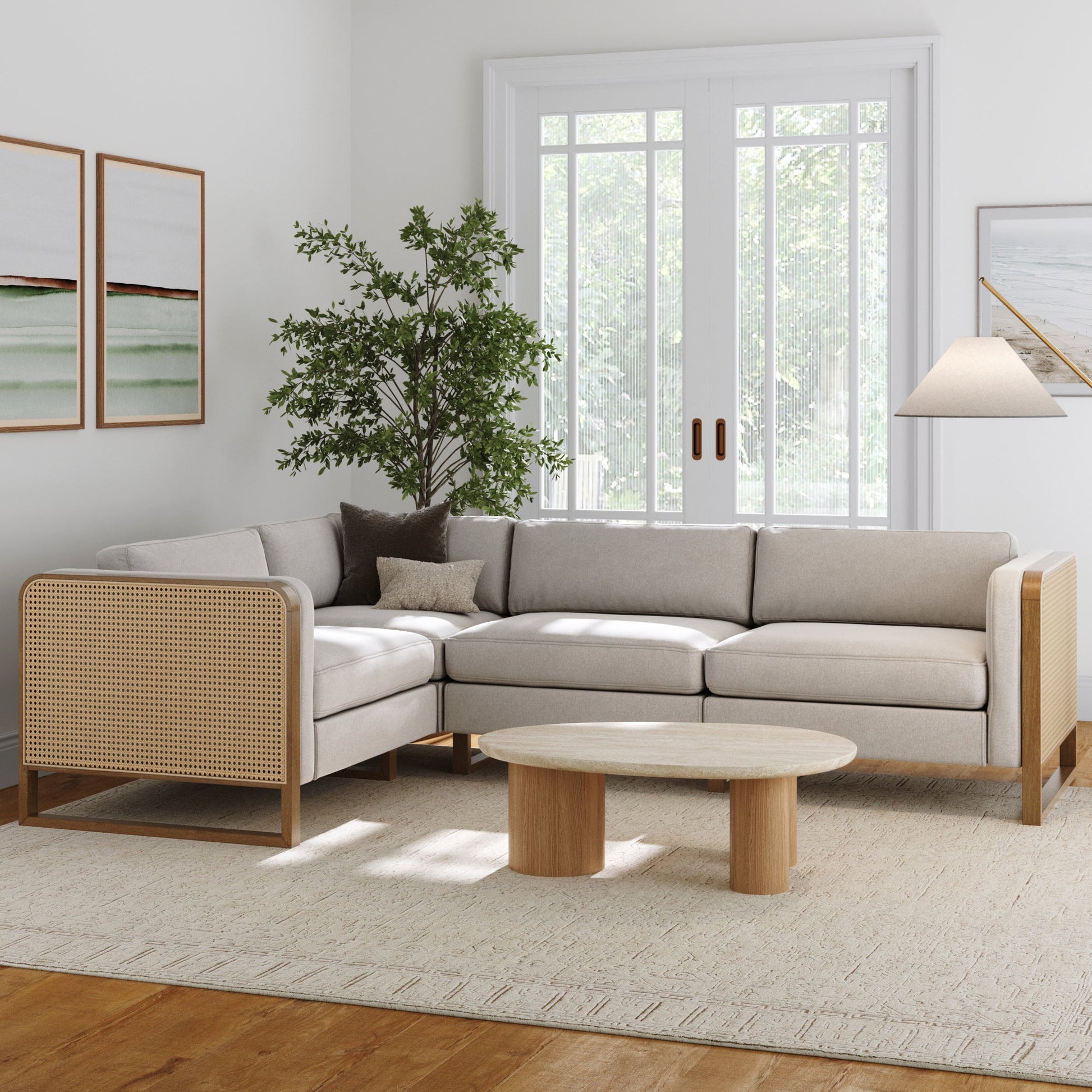Boho 4-Seat Sectional with Wood Frame & Rattan Arm Gray