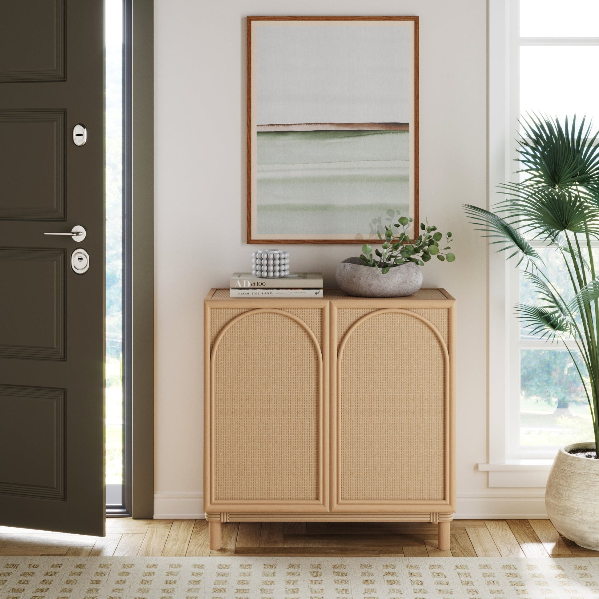 Introducing the Katouche Storage Cabinet. Crafted with rich wood veneer and elegant natural rattan inlays, this cabinet brings warmth and texture to any space. Its solid wood legs and door frames ensure durability, while the integrated handle cutouts add a sleek, modern touch. Inside, you'll find an adjustable shelf to suit your storage needs. Plus, thanks to the natural variations in wood, every Katouche piece is uniquely yours, with its own one-of-a-kind character.