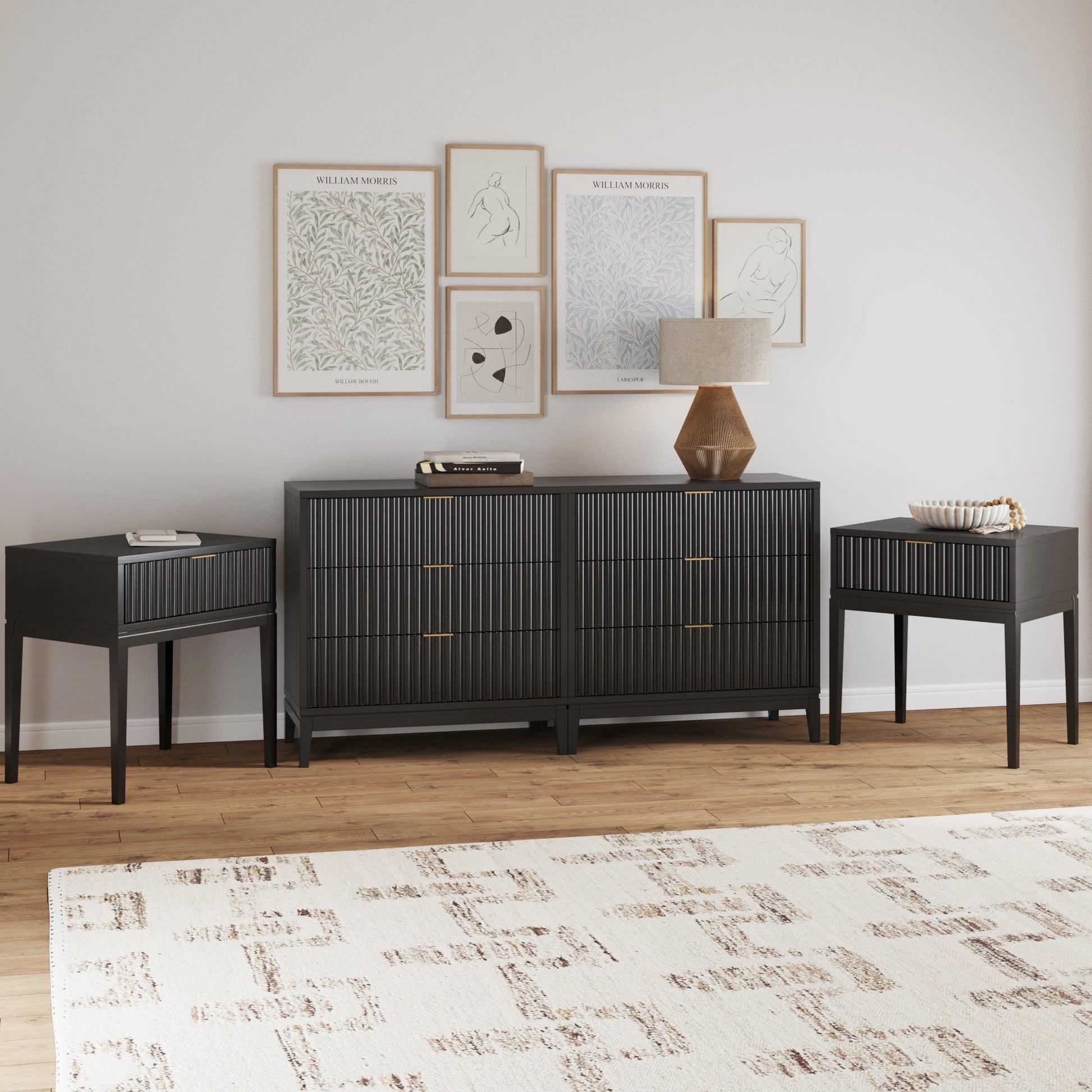 Introducing the Jasper bedroom set—where timeless mid-century modern style meets exceptional functionality. This charming set features fluted details that add a touch of elegance, complemented by sleek, solid wood tapered legs on the nightstands. Enjoy effortless organization with three spacious dresser drawers, each equipped with smooth glide rails and a soft-close mechanism for a quiet, seamless experience. The rich wood veneer brings warmth and sophistication, making the Jasper set a stylish and practical addition to your home. Transform your bedroom into a serene retreat with Jasper!
