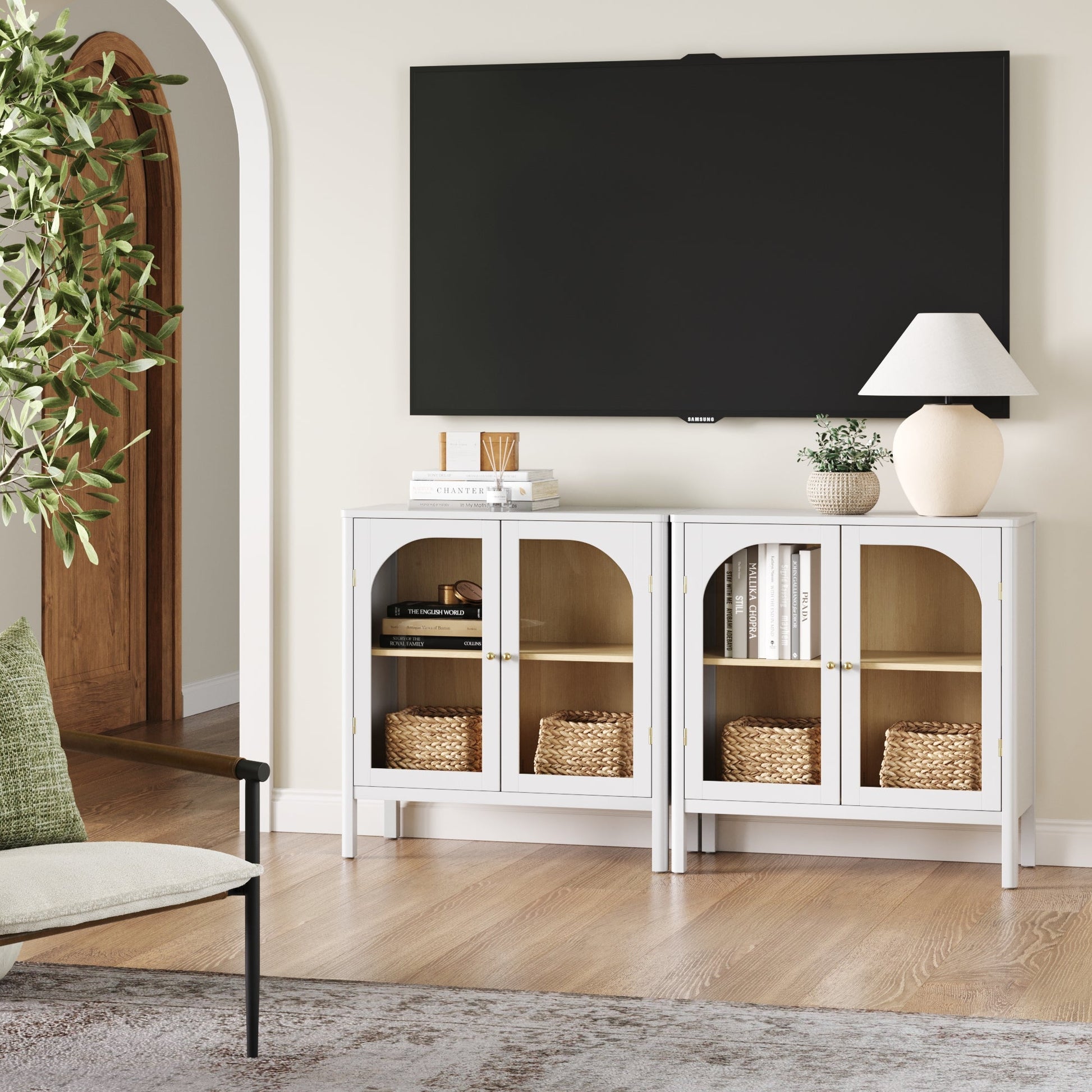 Glass Door TV Console Credenza White (Set of 2)