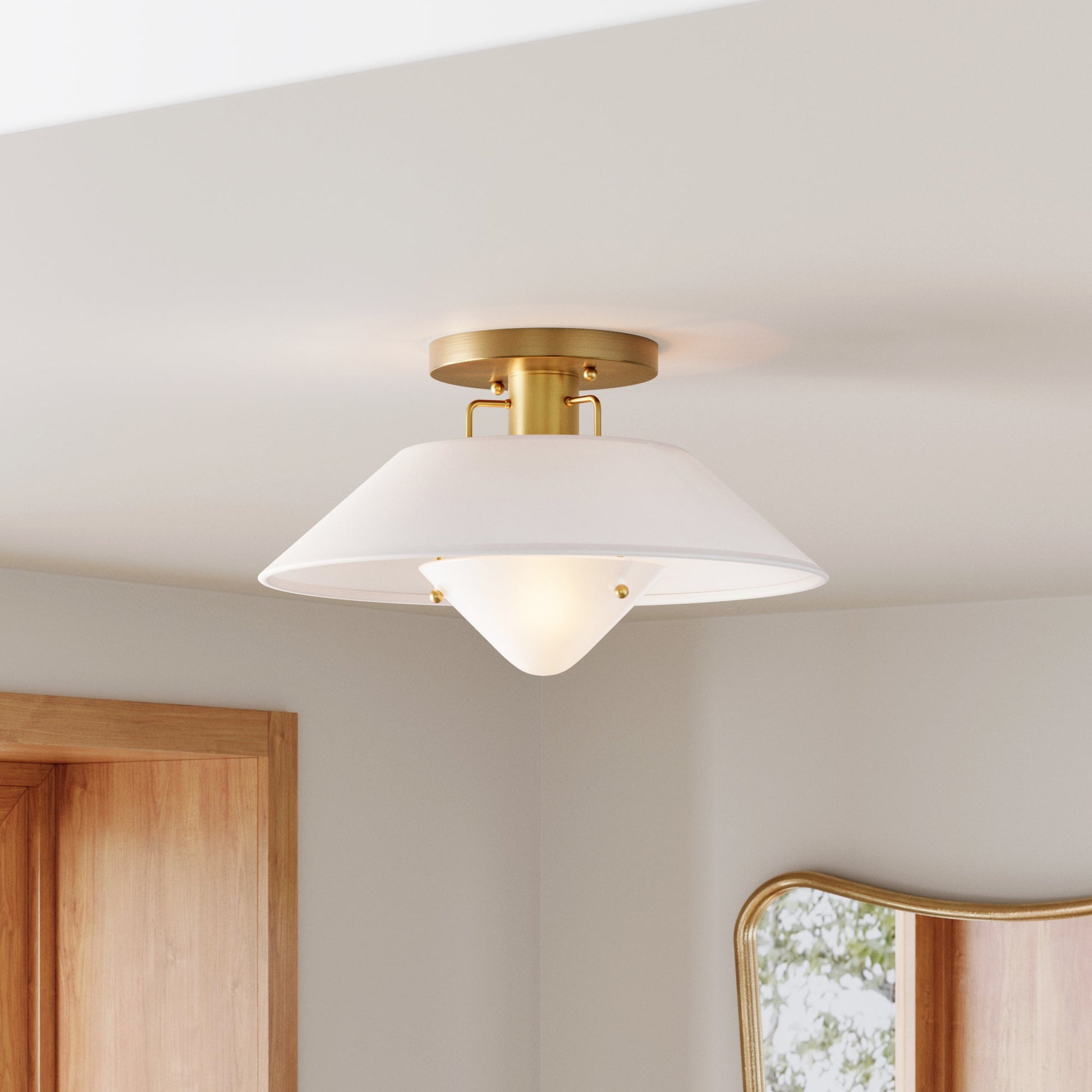 Bring a warm glow to your space with our new Artisan flush mount light—a charming blend of timeless design and modern comfort. Featuring a soft linen shade and frosted glass diffuser, it gently filters light for a cozy, romantic ambiance. Vintaged brass-colored accents add a touch of elegance, while its 60W max capacity ensures just the right brightness for every moment.