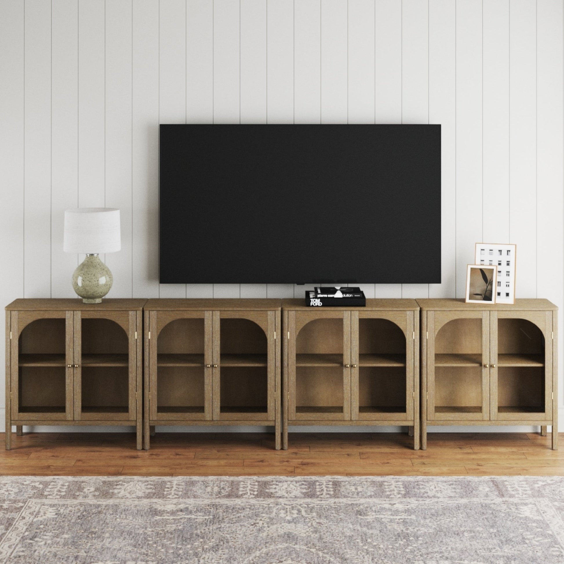 Meet Mason, the modern farmhouse storage cabinet of your dreams. Its rounded frame edge and brass finish hardware combine to create the perfect statement piece for your farmhouse-style home. And let's not forget that wire brushed light brown interior – it's like the warm hug your belongings have been waiting for. Those curved glass doors? They're practically saying, "Put your books, fancy glassware, or your collection of quirky gnome figurines on display here!" Oh, and here's a pro tip: Double the storage and style by placing two of these beauties side by side.