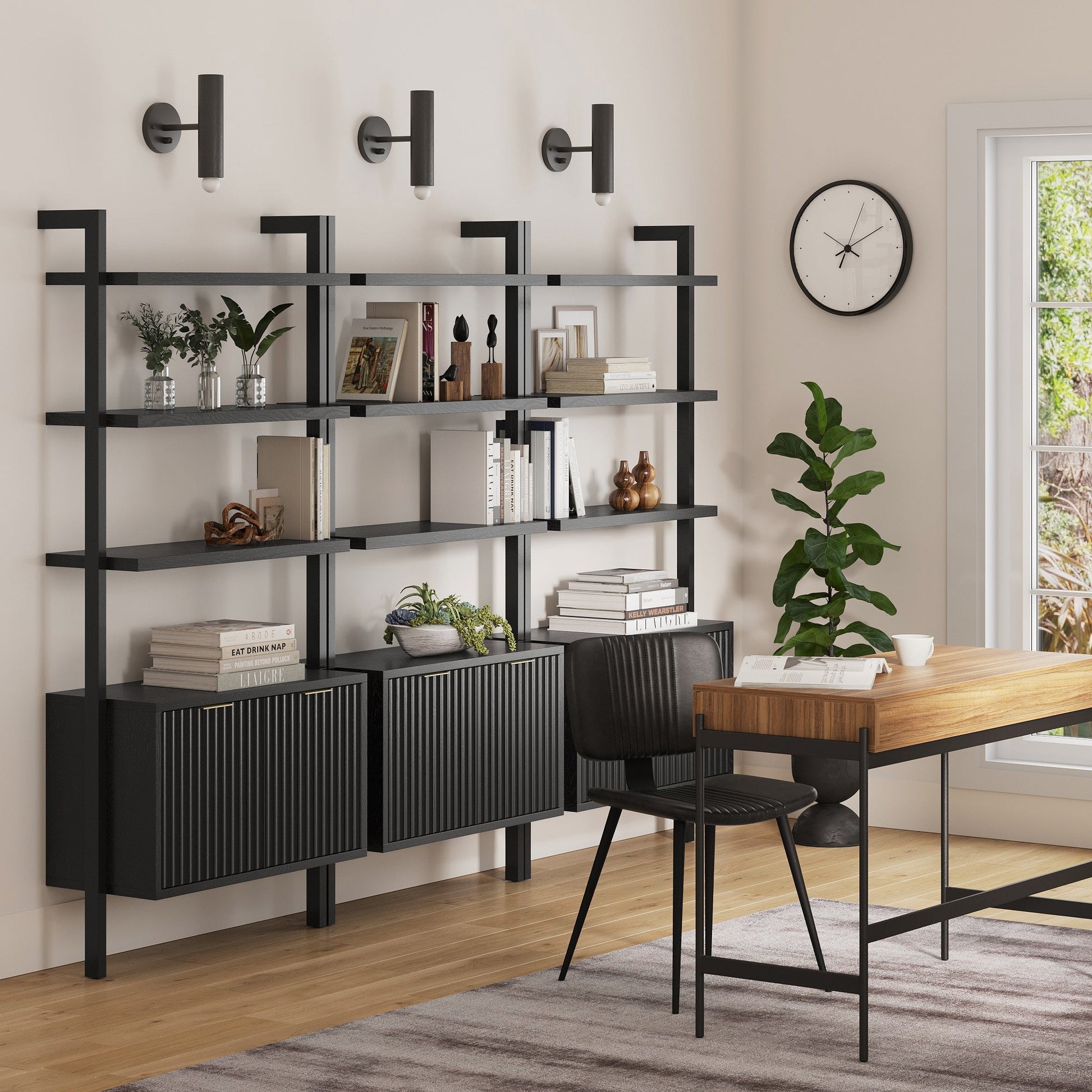Mid-Century Fluted Wall Bookshelves with Doors Black (Set of 3)