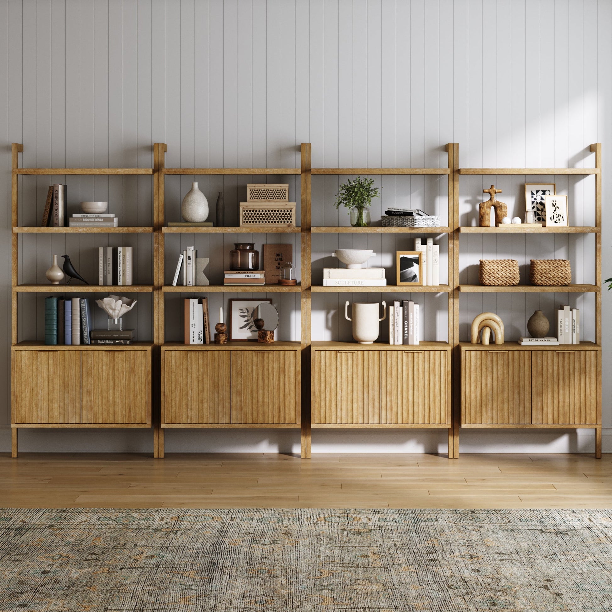 - Fluted cabinet doors Rich wood grain Brass hardware Installation secures the bookcase directly into your wall to prevent tipping Set of 4 bookshelves