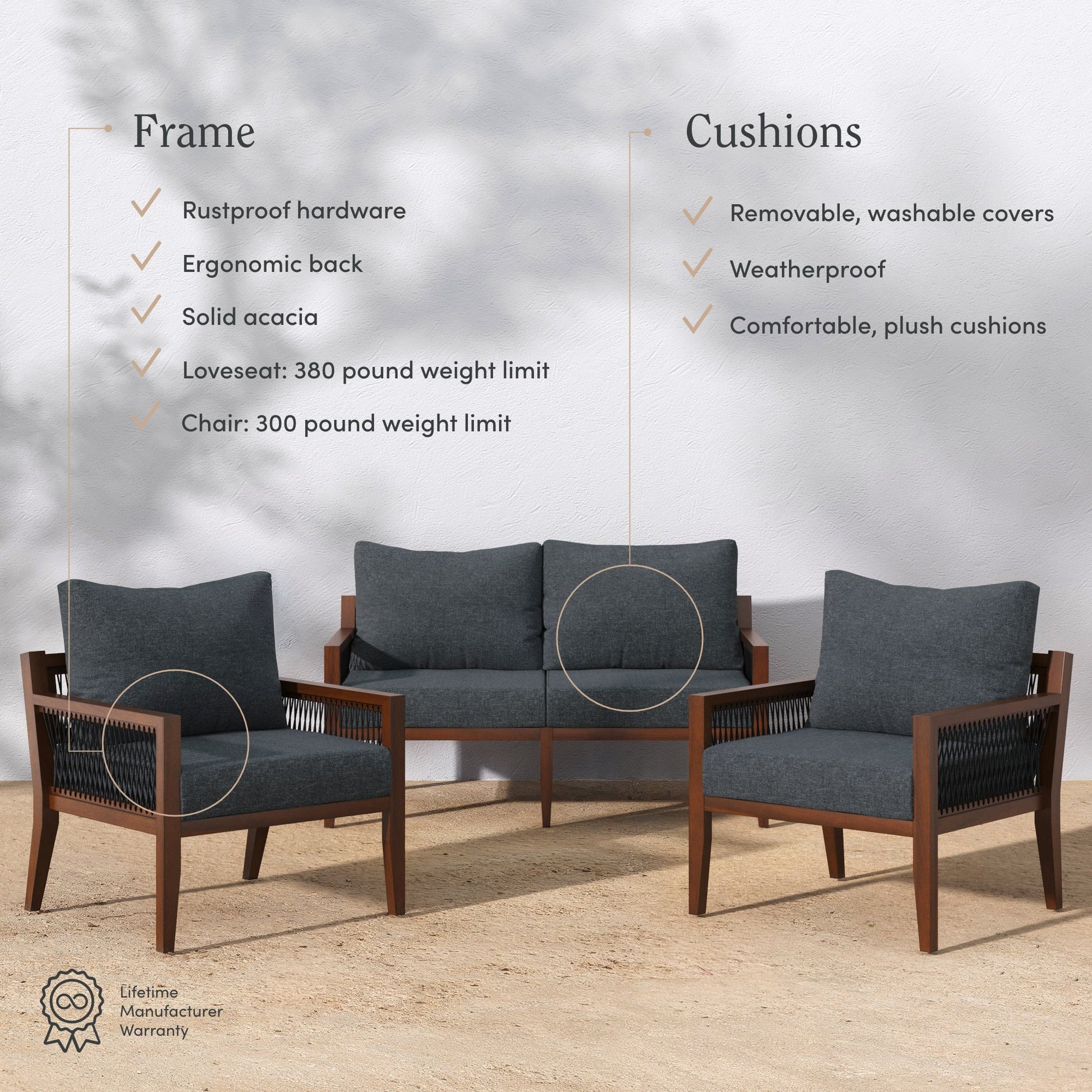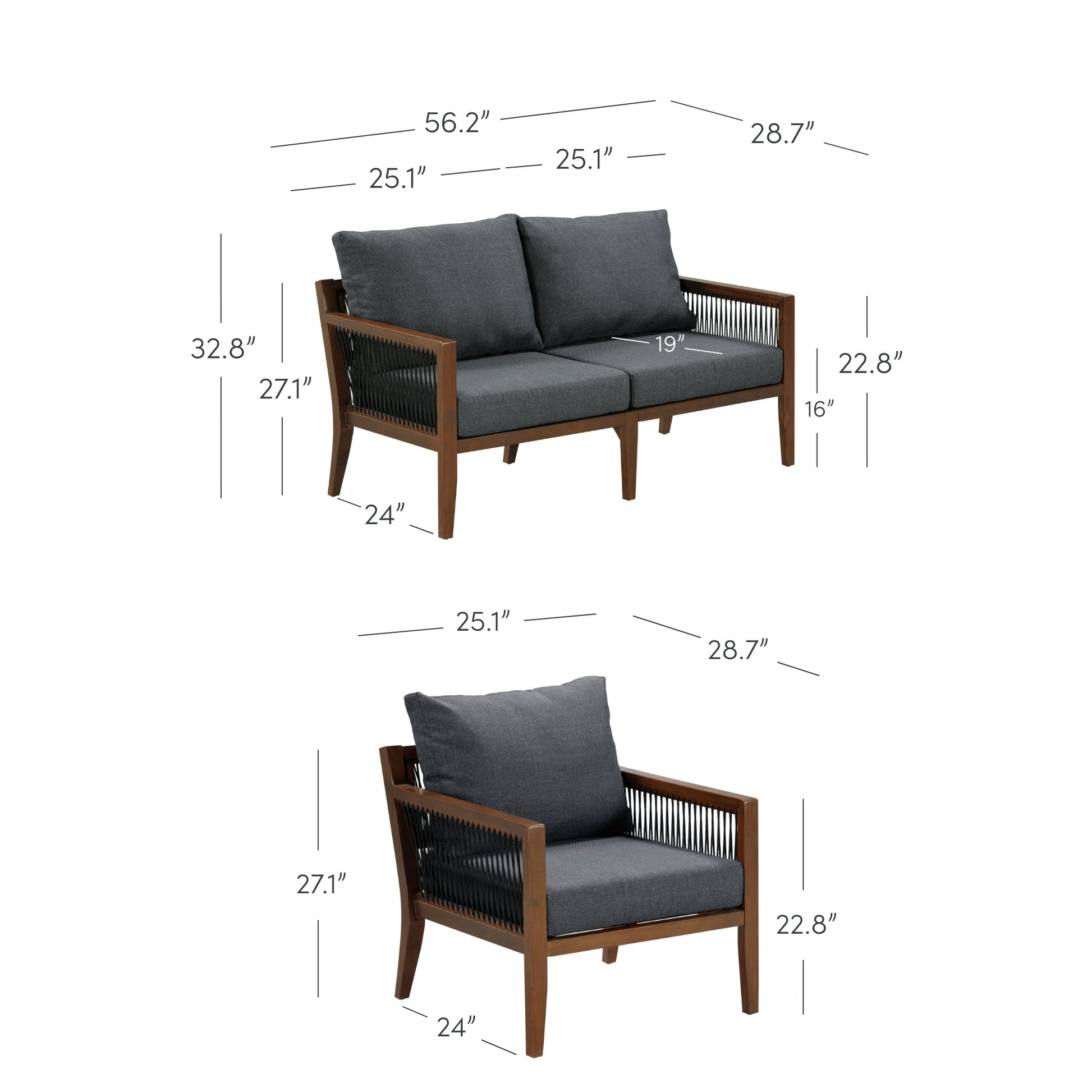 Experience ultimate outdoor comfort with the Freya Loveseat and Chair set! This bohemian-inspired beauty offers unbeatable relaxation. Made with solid acacia wood and easy-to-clean cushion covers, it's built to last. The ergonomic back ensures maximum comfort while the fade and weather-resistant fabric keeps it looking great. Let Freya's plush cushions and sturdy construction transport you to a serene oasis for cozy chats and memorable get-togethers.