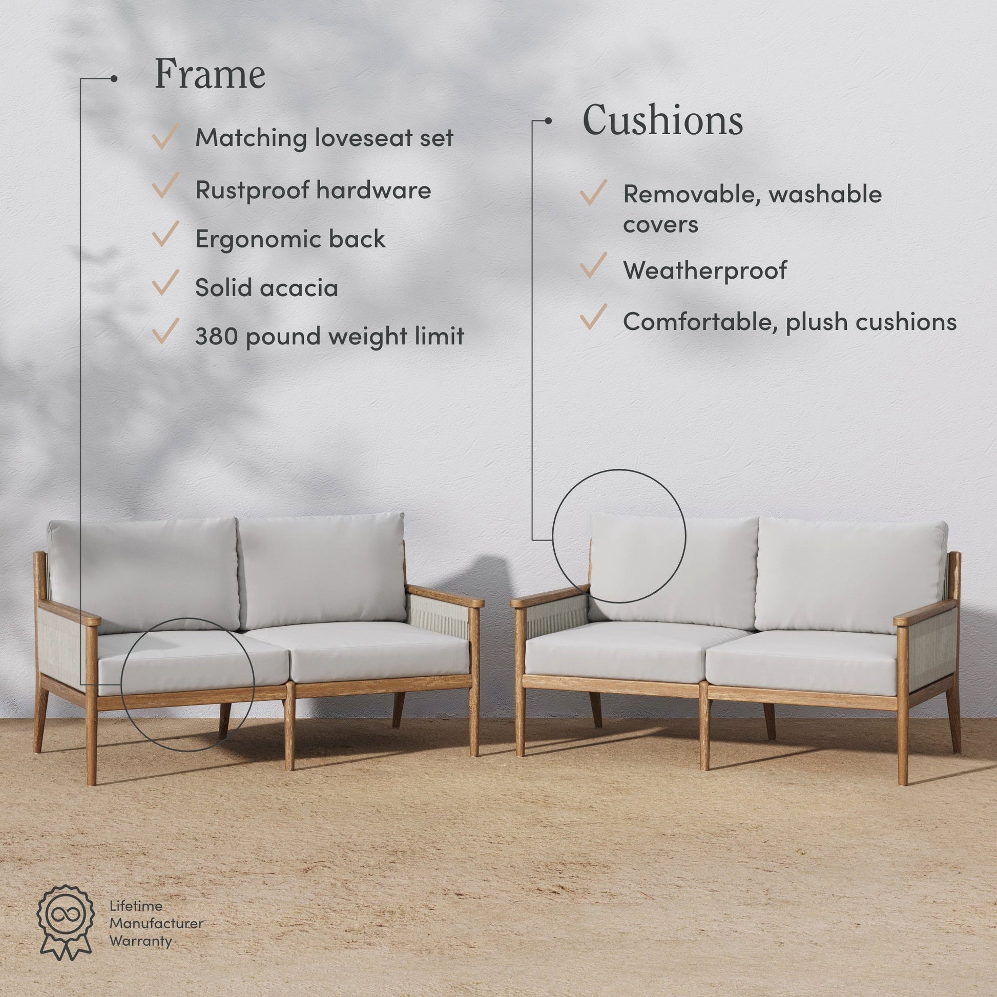 Meet the Kayden Loveseat set—the perfect match for your outdoor sanctuary. This loveseat set elevates your outdoor lounging to a new level of style and comfort. The frame, with its brushed light brown finish, radiates warmth and earthiness. Wrapped with light gray polyester rope details, the set adds a touch of artisan elegance, making it a standout piece. But where Kayden truly shines is in its comfort. The set is adorned with plush, inviting cushions, covered in a resilient light gray fabric that's perfect for any outdoor setting. It's spacious enough to share, yet cozy enough for those moments of solitary relaxation. Whether you're enjoying a sunset with a loved one or lounging with a good book, the Kayden Loveseat set is your go-to for outdoor comfort and style.
