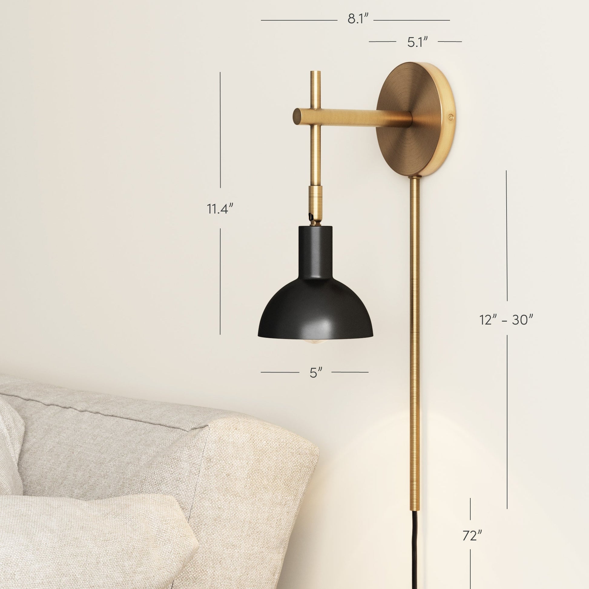 Renters rejoice! Meet Tamlin, our plug-in wall light perfect for reading nooks, living rooms, and bedsides. Extending from a circular wall plate is an elegant vintaged brass finish metal arm with a matte black round bell shade. Its articulating feature allows you to direct the light left or right and is dimmer compatible, for those nights you can't put your book down. This wall light is a must-have for small spaces, apartments, and townhomes and can be placed in your favorite spot without worry thanks to the included cord cover. Or ditch the plug-in and take it to the next level by getting this light professionally hardwired by an electrician.