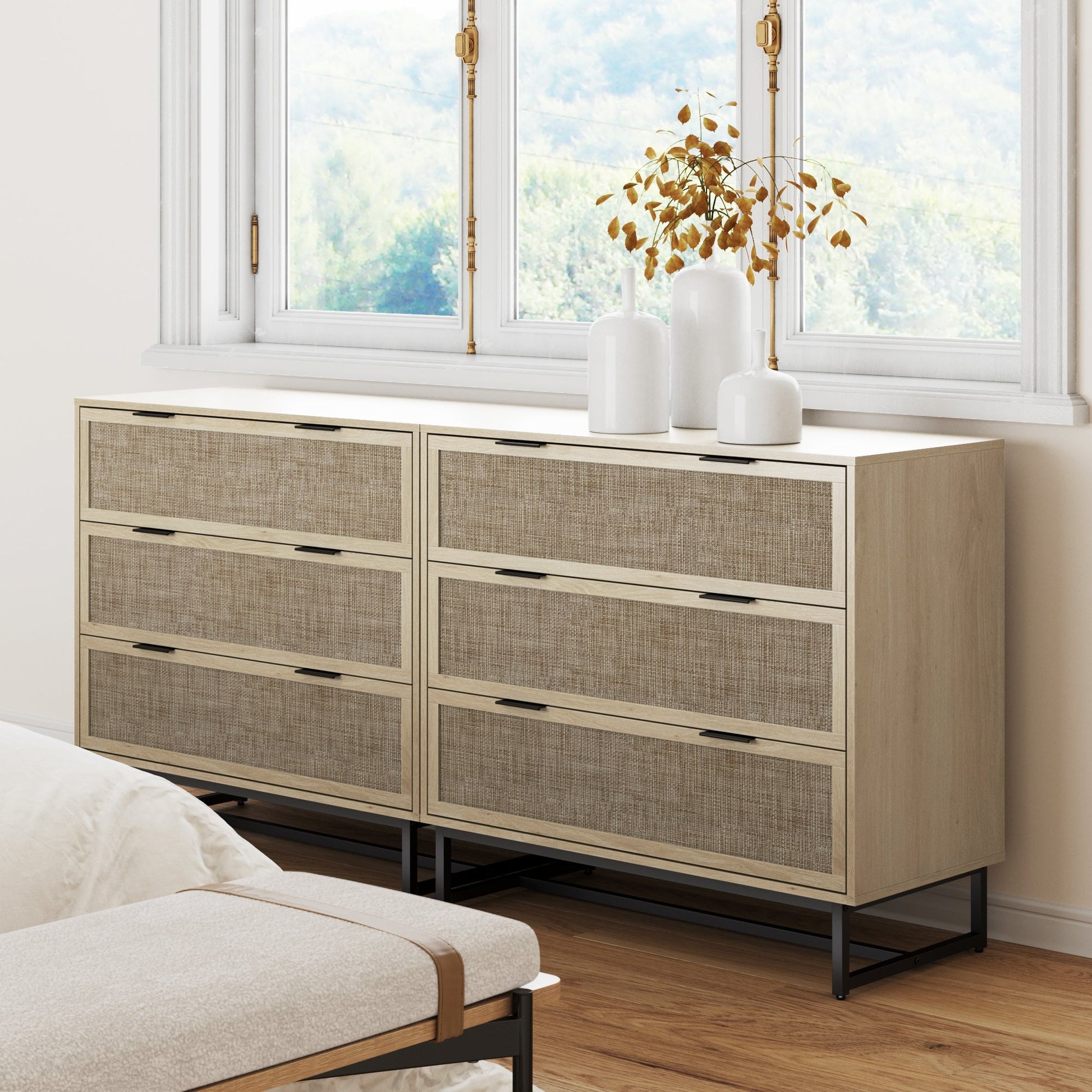 Introducing our newest gem in the Kova furniture collection: the Kova Dresser! Designed to blend style with practicality, this dresser is a perfect mix of modern and bohemian vibes. It features a sturdy powder-coated metal base and drawer pulls, ensuring durability and longevity. We've included leveling floor protectors to keep it steady on any surface. The three spacious drawers slide effortlessly on strong metal slides, making it a breeze to access your belongings. And here's the fun part—you can pair multiple units side-by-side for a bolder, more personalized statement piece. What truly sets the Kova Dresser apart is its eye-catching drawer fronts, adorned with durable, woven textilene rattan, adding a unique, textured charm to your space. Get ready to elevate your room's look with the Kova Dresser—where functionality meets flair!