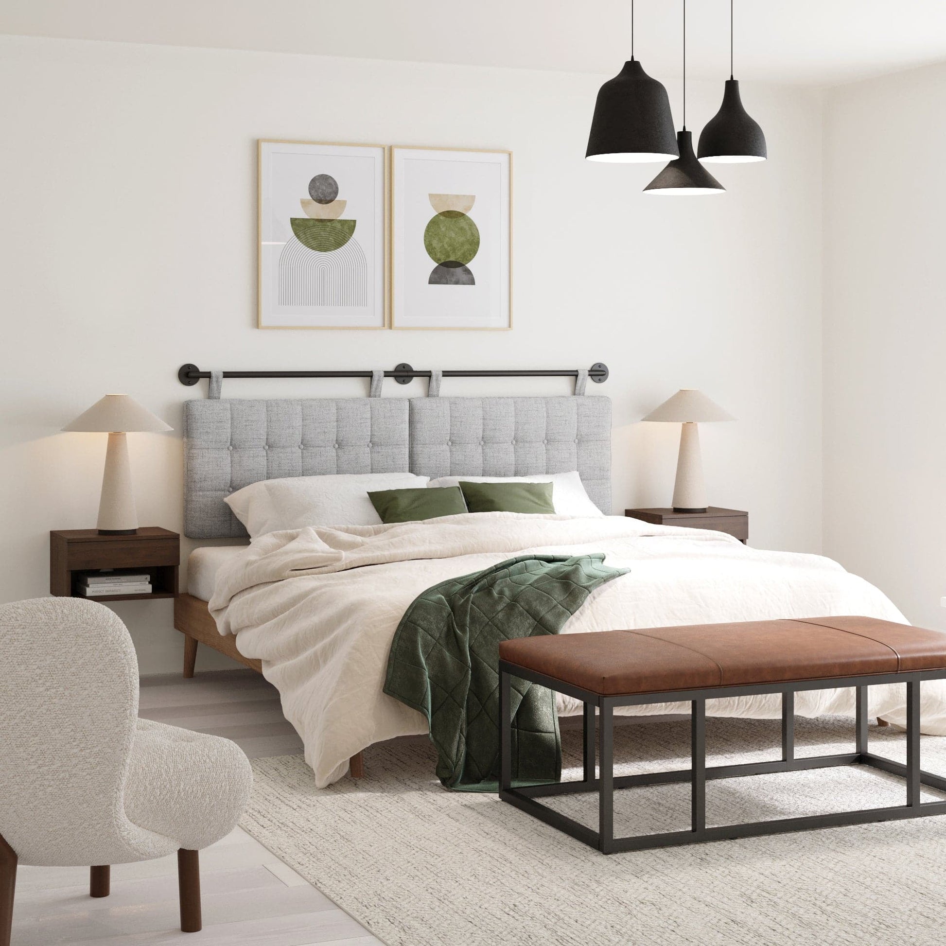 - For an industrial look, use the sturdy black metal rail to hang your button-tufted headboard
