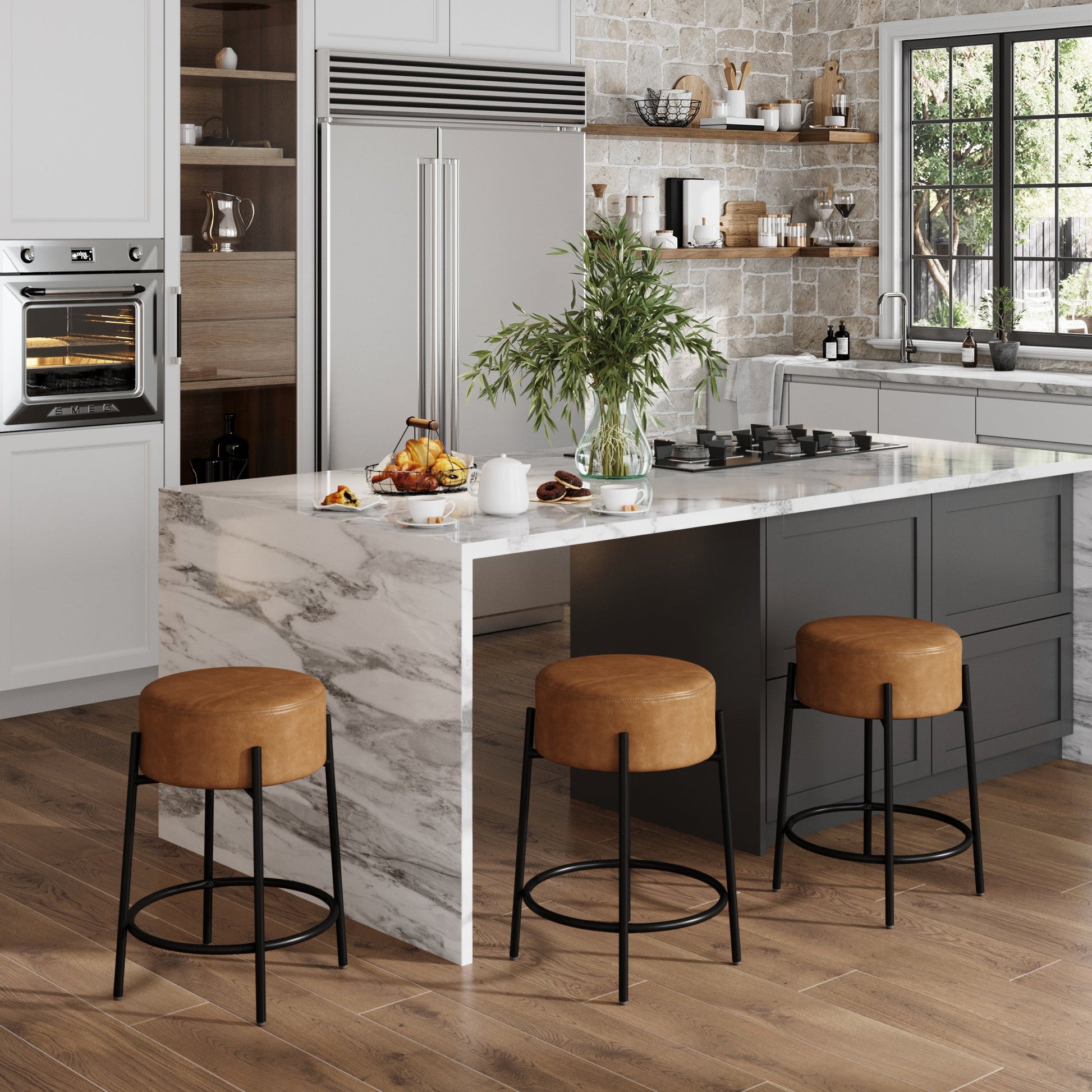 Round Faux Leather Backless Counter Height Bar Stools Brown (Set of 3)