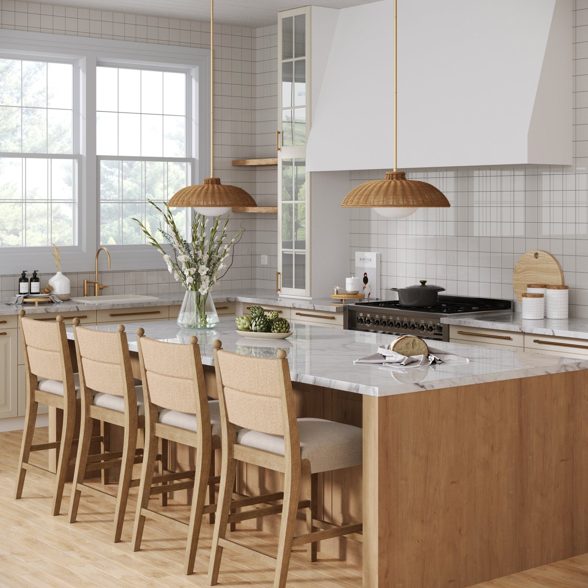 Pull up a seat in style with the Cove Bar Stool, the perfect blend of coastal charm and everyday comfort! With a 24-inch seat height, it's just right for cozying up to your kitchen counter or home bar. The synthetic seagrass woven backrest adds a breezy, natural touch, while the upholstered seat cushion—complete with extended wraparound details—keeps you comfy for hours. Built on a solid wood frame with elegantly tapered legs, this stool is as sturdy as it is stylish. Plus, thanks to the unique character of natural wood, each piece boasts its own one-of-a-kind color and texture variations. Whether you're gathering with friends or enjoying a quiet meal, the Cove Bar Stool makes every seat the best in the house!