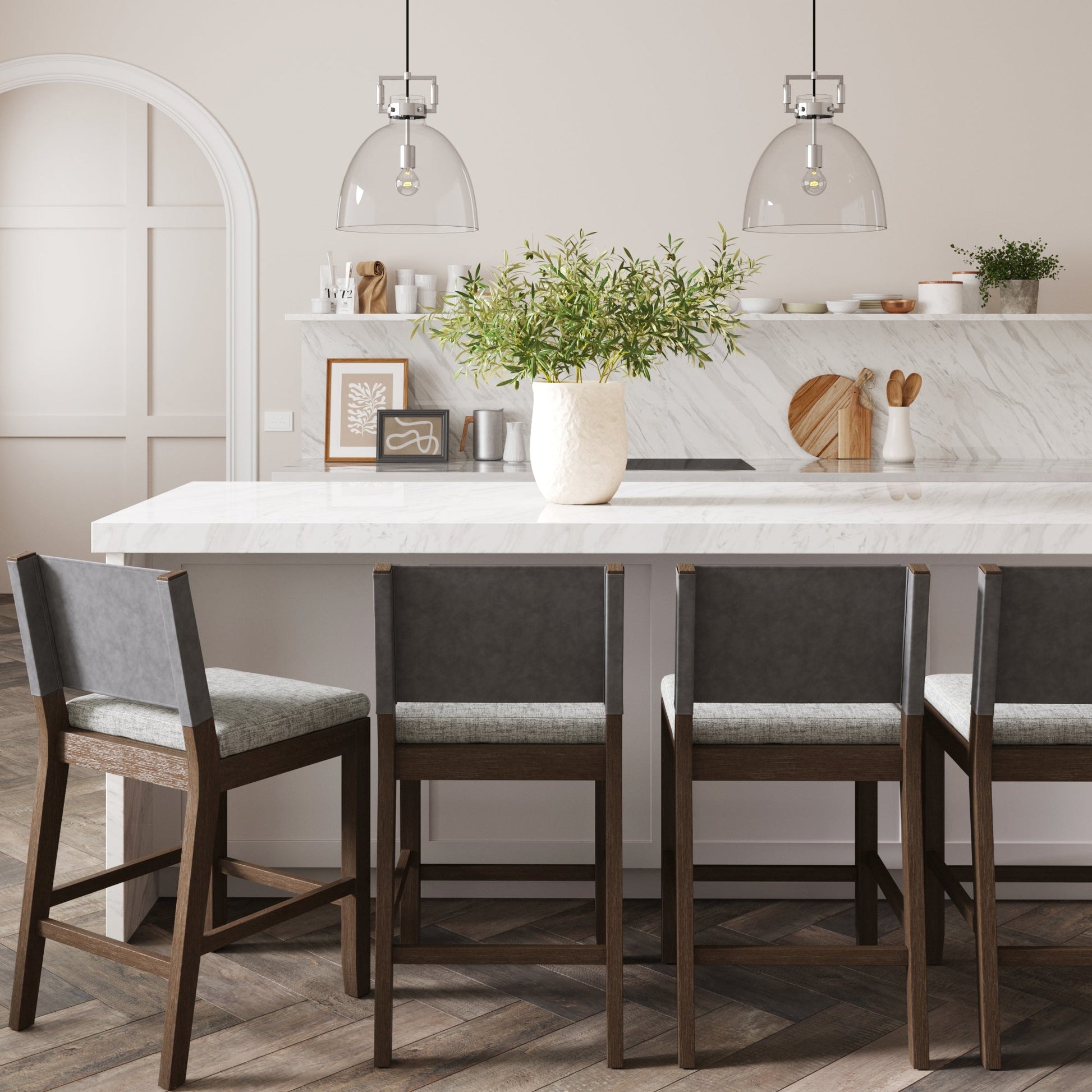 We loved our Linus Bar Stool so much, we had to make it in another color combination. Our set of 4 Linus bar stools features a thick, durable cushion covered in grey birch ivory material paired with contrasting rubber wood legs in a brushed dark brown wash. Linus adds comfort and style to any kitchen with its clean modern lines and faux leather seat back in a beautiful pewter gray finish. It has a built-in footrest so you can enjoy each meal in complete comfort. This timeless bar stool will seamlessly blend in with your modern farmhouse home and the best part: it takes only 15 minutes to assemble!