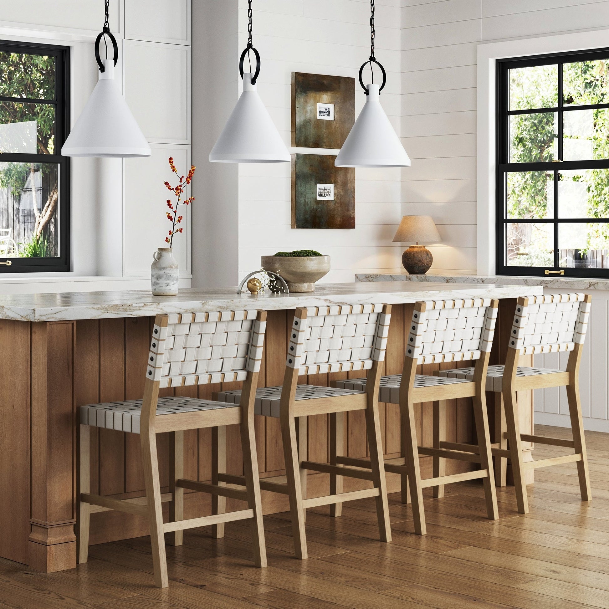 We can't help but rave about the Cohen counter stool! This mid-century modern piece features a solid white oak wood frame that exudes warmth and character, with each piece boasting unique variations in color and texture. The off-white woven faux leather back and seat offer a chic and comfortable perch, perfect for any kitchen counter area. Standing proudly at a 24" seat height, the Cohen stool combines durability, style, and a touch of individuality, making it a standout addition to any space. Embrace the natural beauty and sleek design that the Cohen brings to your home!