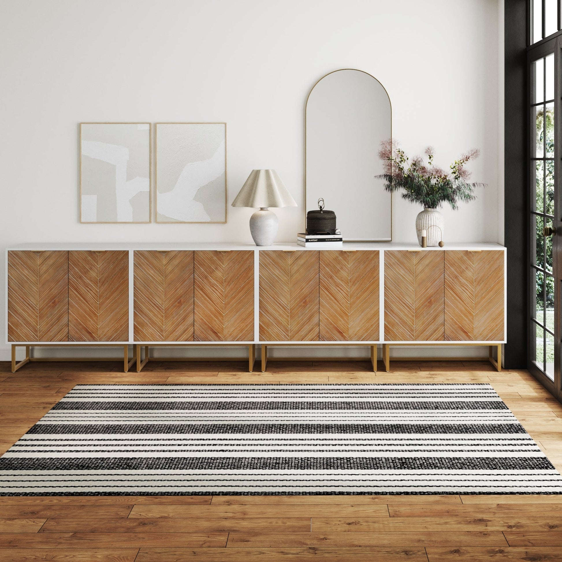 A beautiful hideaway. The Enloe storage cabinets feature rustic solid wood doors that have beautiful herringbone design juxtaposed against clean white painted frames for a modern meets rustic feel. This set of 4 cabinets are held up on beautiful brass powder coated legs that have footpads attached to keep your floors from being scratched. With two swinging doors, these cabinets offer plenty of hidden storage and enough space to keep your home clutter-free.