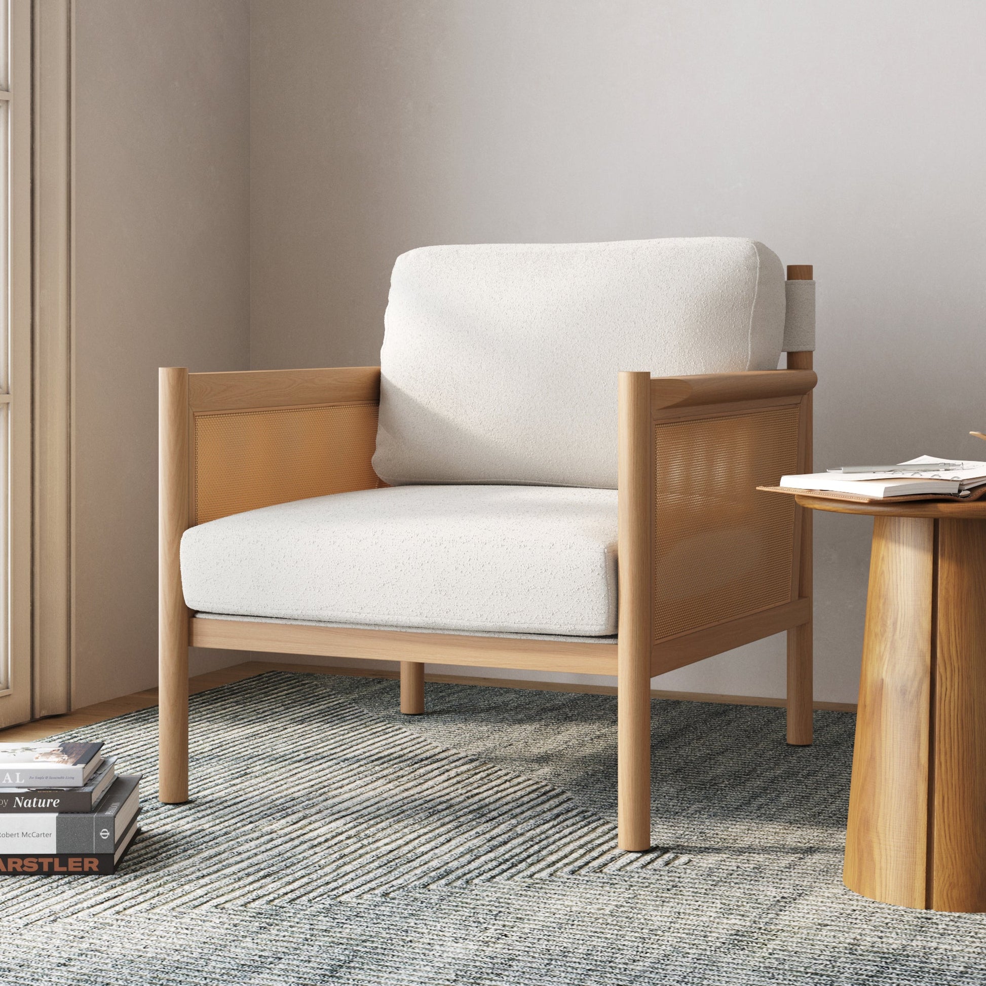 Solid Wood Boucle Accent Chair Rattan Arm Cream/Raw Oak