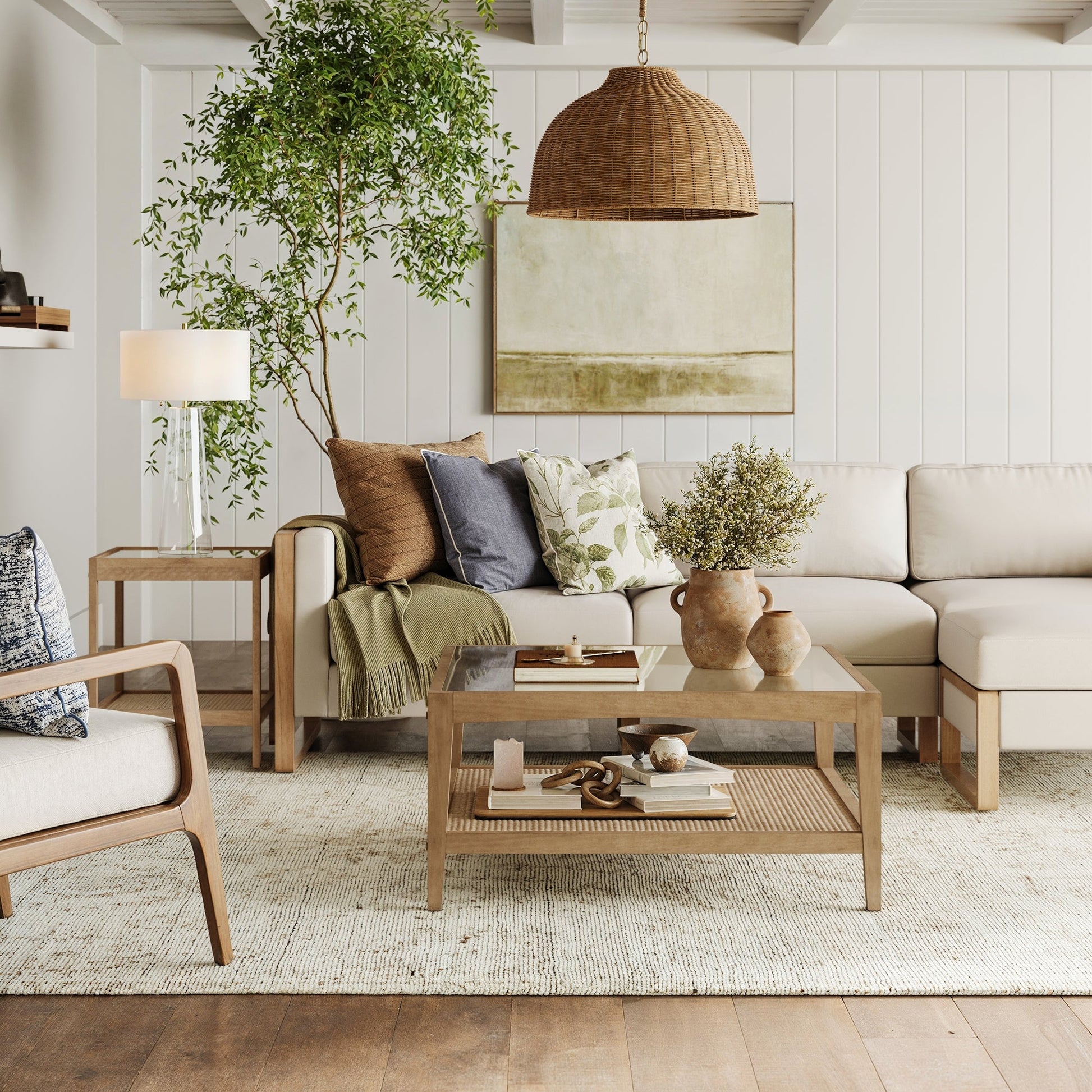 Square Glass & Rattan Coffee Table with Solid Wood Legs