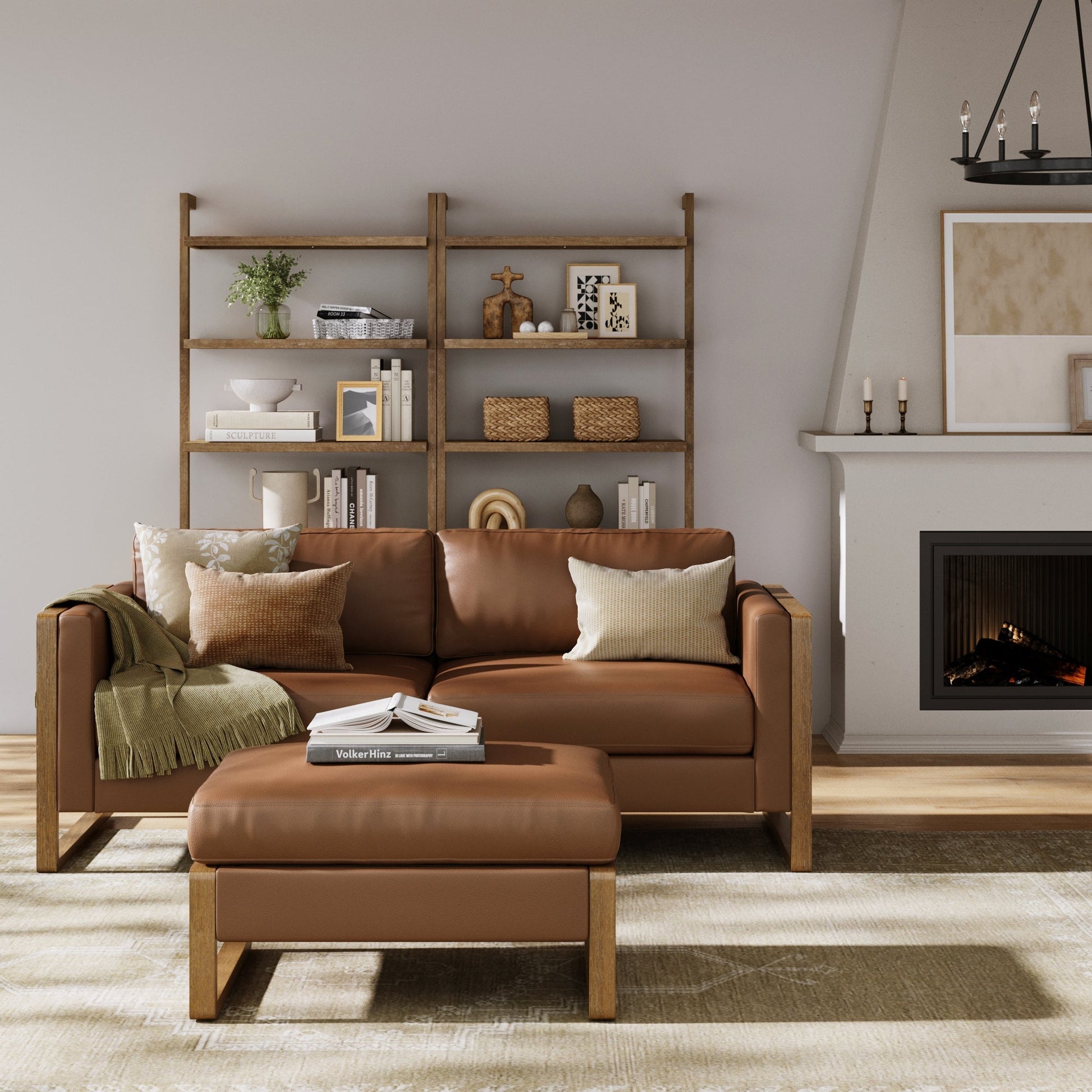 Leather Wood Frame Loveseat Sofa Couch & Storage Ottoman Camel
