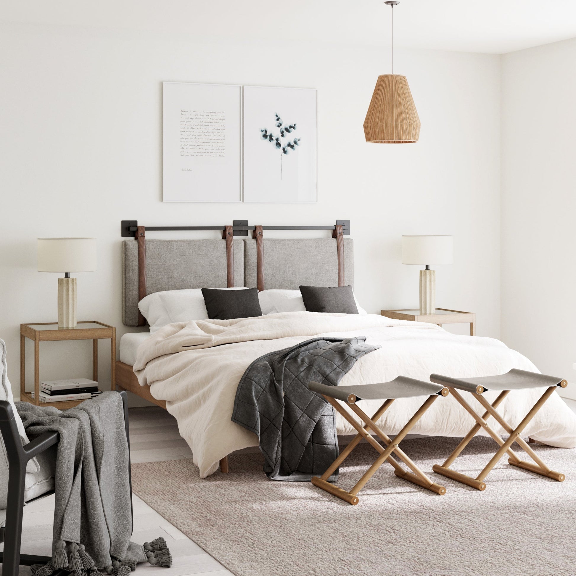 Meet Harlow. You’re not dreaming - you can elevate the look of your bed and add comfort without the commitment! Harlow is wall-mounted and easy to install. This headboard includes two lightweight panels upholstered with an airy feather grey linen-inspired fabric. Vintage brown vegan leather straps allow you to hang it with or without the included suspension rail (perfect for small spaces). Need to add some softness and style to a seating area? You can lean on Harlow. Hang these panels in an entry, dining, or banquette area behind a bench or a set of stools. Available in King/California King and Queen/Full.