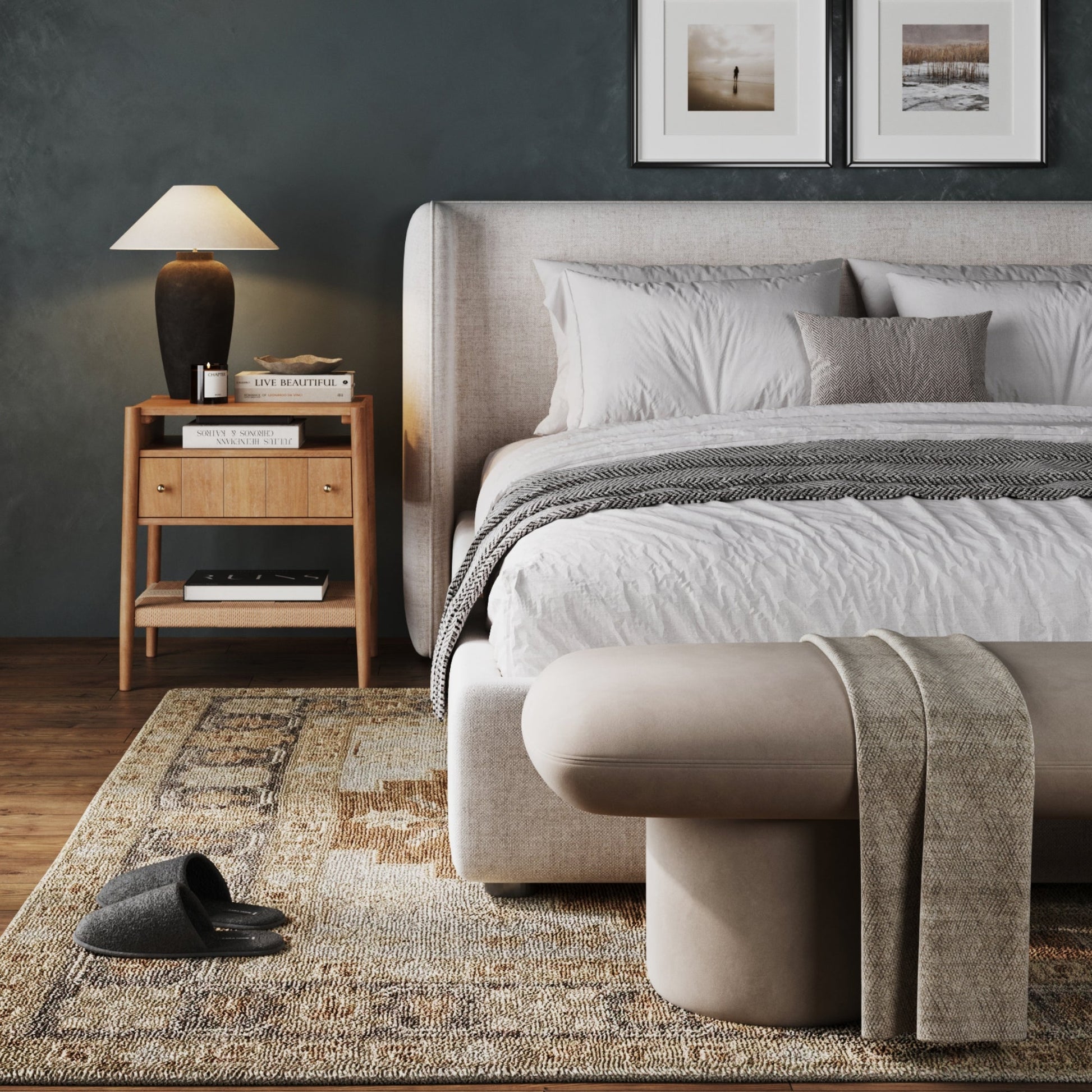 Add a touch of warmth with the Meads wood nightstand—a piece that feels like it has story to tell. Crafted from solid wood, its tapered legs and timeless silhouette bring a soft elegance, perfect for a cozy bedroom retreat. The natural grain patterns ensure no two pieces are exactly alike, making each one unique. A vintaged brass-colored handle graces its spacious drawer, designed to keep your nighttime essentials tucked away. Below is a woven synthetic seagrass shelf for an airy and organic charm.